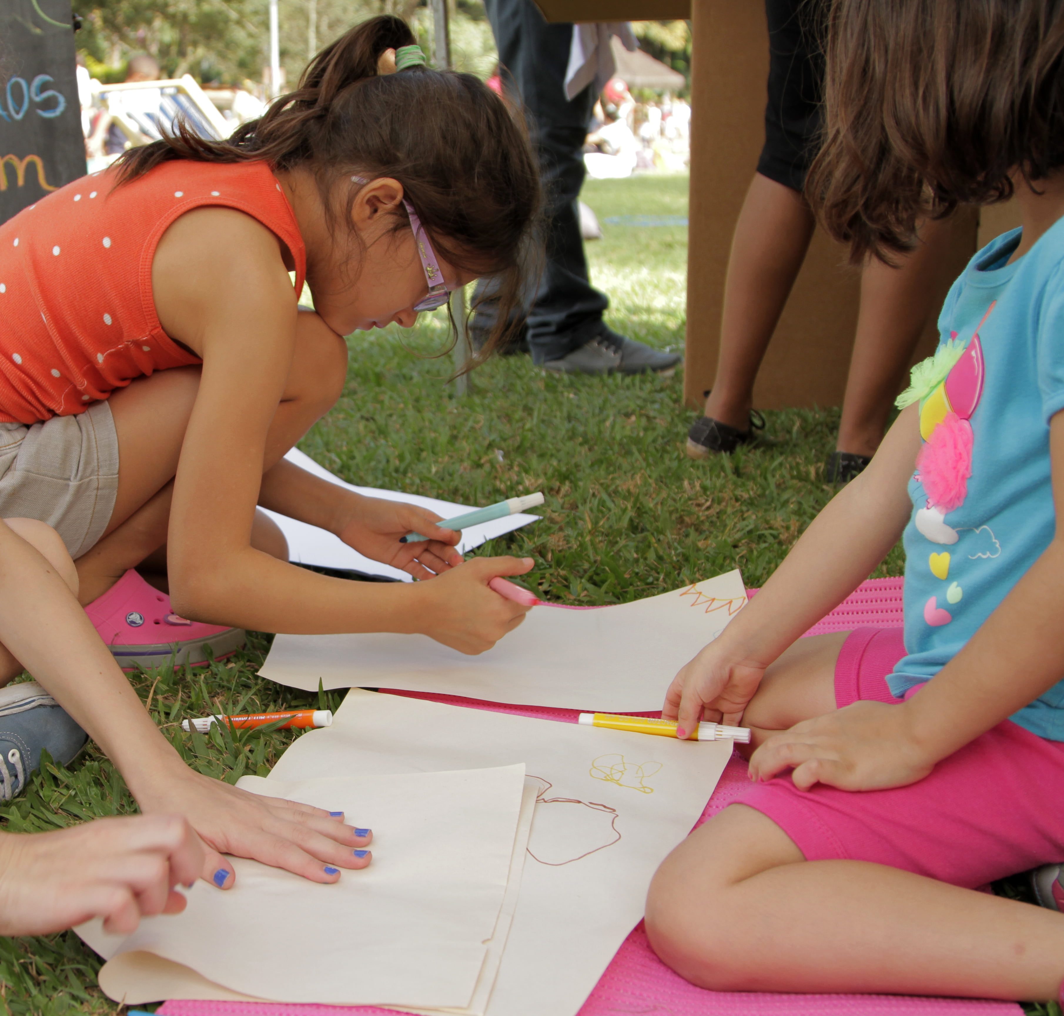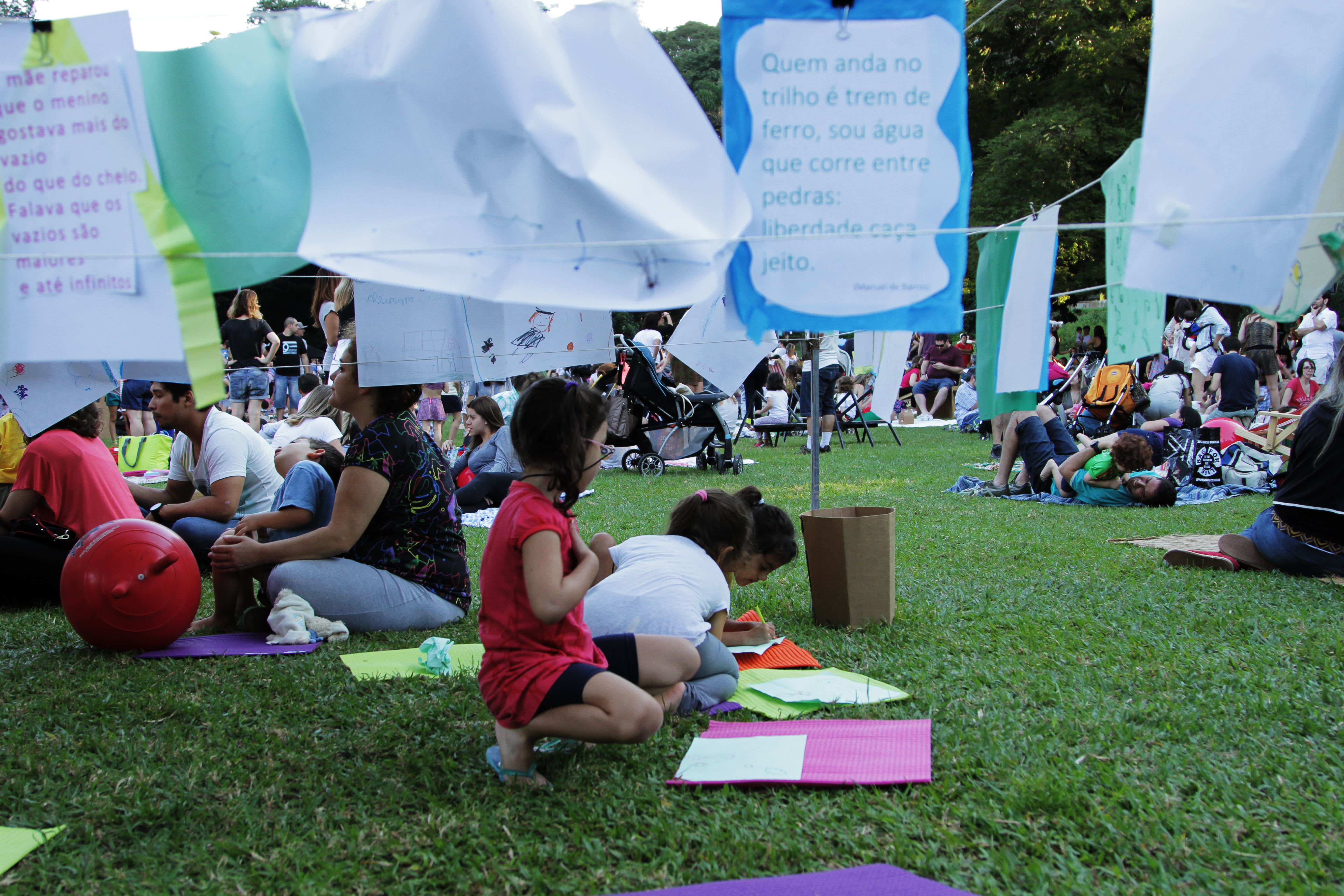 Domingo, 24 de maio de 2015 – Slow Kids (Parque Burlemarx). Em uma tenda no gramado, papeis e varais são pendurados, enquanto inocentes canetas coloridas aguardam ansiosas por mais uma Feira de Trocas de Brinquedos. Crachás, poemas, esteiras e cangas. “Cadê papel pra desenhar? Esse chão é mole, não dá pra tinta pegar”. Nomes, etiquetas, alfabeto, objetos, tamanhos, preços e histórias. “Não vou escrever meu nome com esta caneta cor-de-rosa…”