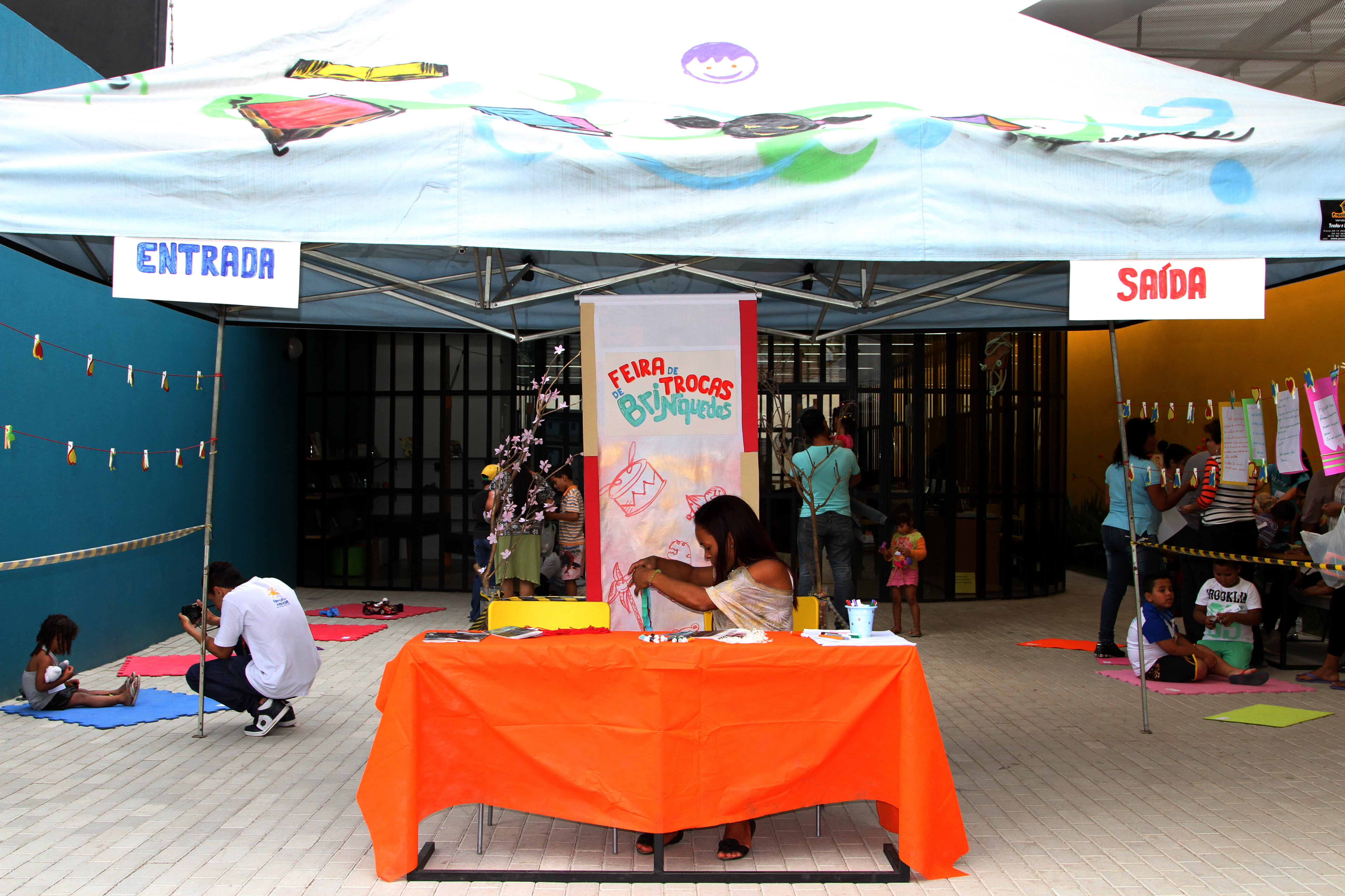 “Ô tia, esse brinquedo aqui pode pegar?”. “Só se você trouxer outro e colocar no lugar”. “Mas eu não tenho nada”. “Você não quer criar?”. Puxa, estica, amassa, embola, fecha, gruda, chuta. O menino sai correndo com sua nova bola com um grande valor agregado: jornal, fita adesiva, celofane e uma bexiga enchida com ar do seu próprio pulmão. Ele se esquece de voltar para a Feira de Trocas para troca-la pelo brinquedo que havia lhe interessado.