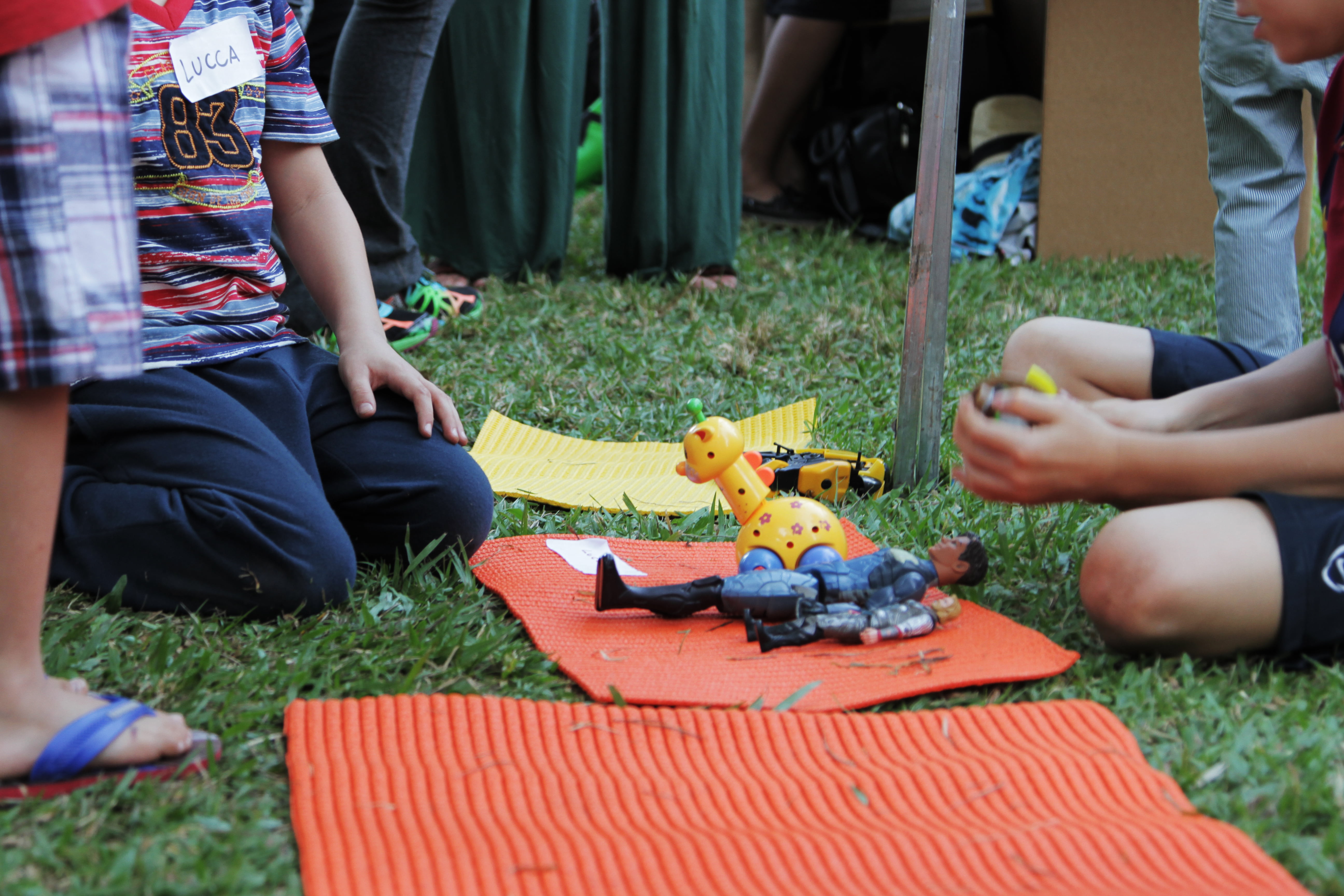 Domingo, 24 de maio de 2015 – Slow Kids (Parque Burlemarx). Em uma tenda no gramado, papeis e varais são pendurados, enquanto inocentes canetas coloridas aguardam ansiosas por mais uma Feira de Trocas de Brinquedos. Crachás, poemas, esteiras e cangas. “Cadê papel pra desenhar? Esse chão é mole, não dá pra tinta pegar”. Nomes, etiquetas, alfabeto, objetos, tamanhos, preços e histórias. “Não vou escrever meu nome com esta caneta cor-de-rosa…”